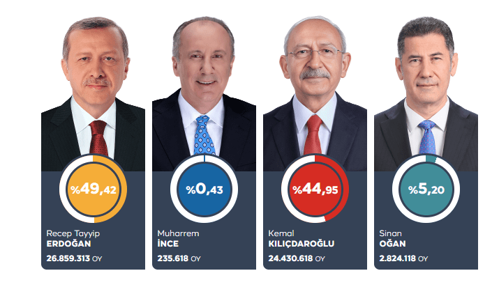 كما حصل مرشح تحالف الأمة كمال قليجدار أوغلو على 44.96 بالمئة من الأصوات في الانتخابات الرئاسية، بعد فرز نحو 99 بالمئة من الأصوات.